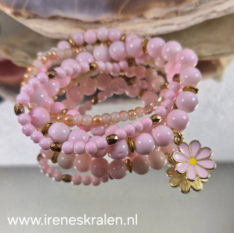 Verschillende zachtroze glaskralen en een bloem-bedel